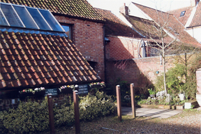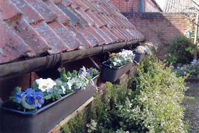 The Meeting House is in a small yard called Pegg's yard, which was named after Mr. Pegg an Aylsham builder. The yard has four houses in it and our Meeting House. We put 'window' boxes on the lower roof to brighten up the area for the residents and visitors/hirers coming to the building. As you can see from the posts and shingle there are three parking spaces. |
