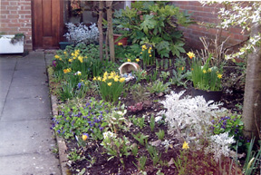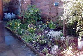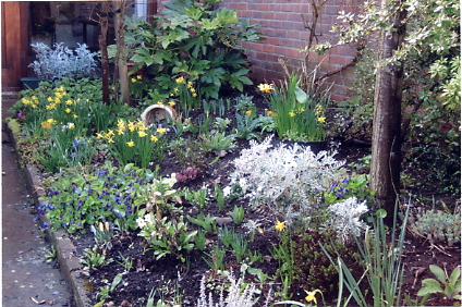 The garden because of its position is very difficult to maintain. In the spring there is no problem as bulbs grow readily but most are renewed each year. In the summer it is a difficult garden to keep going because of it being so shaded and for much of the time so dry. Two plants which enjoy their situation are geranium endressii and a fern. |